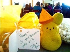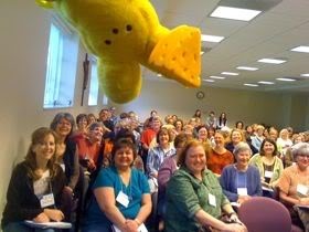 After I left Milwaukee, I headed to Madison for the SCBWI Wisconsin Fall Retreat. Peeps was presented with an honorary cheesehead hat prior to my keynote to these future mega-million lottery winners . . .