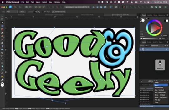 The Affinity Designer warp tool works fairly well. You have a number of different types of warps available. There are simple ones such as quad and perspective. These are fine to use if you’re just using the four corner nodes to distort your design. I found when I put a quad warp onto anything and then changed any of the sides of it to a curve, it turned into a mesh type warp. A simple mesh with just the four corners which is different from the mesh you get from the Affinity Designer warp choices. The Mesh Warp has more nodes in it in the centre of the rectangle.