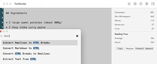 This is another utility application I recently found which does wild and wonderful things with text. It is for manipulating text with 128 mostly useful commands and not for writing code or markdown. You can either open the application and paste the text into it and press command T to bring up the list of possibilities. Or in whichever application you are editing your text activate text body from the services menu. This takes you straight into the list of commands. There are a lot of commands unfortunately you have the possibility to search for what you want to do. There are simple things like removing blank lines or transforming to title case. There are web programming things like stripping HTML code or converting markdown to HTML.