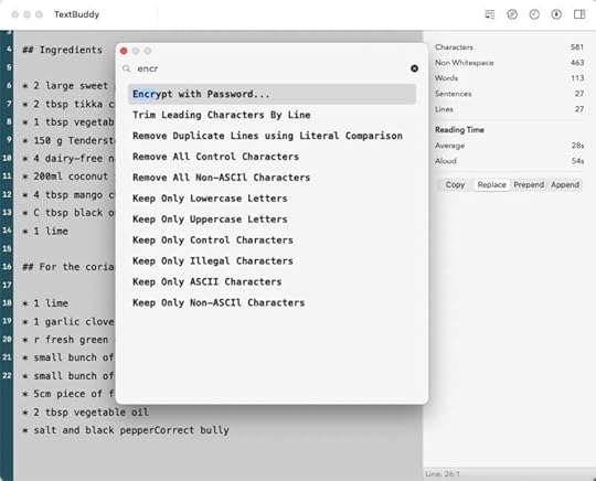Good and Geeky Verdict on Text BuddyIt’s an amazing application which does wild and wonderful useful things with your text. It’s worth getting if you often have to process text to make it look and work right. There have been many occasions when I’ve got a lump of text which had things in it which needed to be removed either on a character, line or paragraph basis. I have a similar application which does things to text on iOS. The list of commands available are extensive and with plenty of variety. I’m impressed with the application and all it can do.