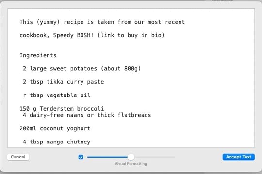 The OCR works well. Drag a file in and it finds the text in an image. I dropped in an image of a recipe and it did the job almost perfectly. Just a couple of the numbers were converted incorrectly. Not bad considering it was white text on a black background. There’s a slider which affects how the text is presented. Push it to the left and all the text starts left justified on the page. I did another command to finish off to remove blank lines. I do have another application for OCR called Owl OCR which did a better and quicker job with the same image.
