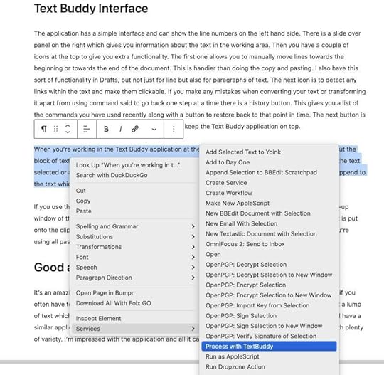 Get to this with a right click or two finger tap on the trackpad.If you use the Text Buddy application from the services menu – Process with Text Buddy – you get a pop-up window of the list of commands to choose from. Choose whichever one you want and the processed text is put onto the clipboard. You can then either pasted over the top of your selection in whichever application you’re using all paste it wherever you want it to be.