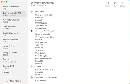 This is a more complicated macro which I ran through first without recording before doing it again for real. It starts in Drafts where I do most of my writing. I set it to: