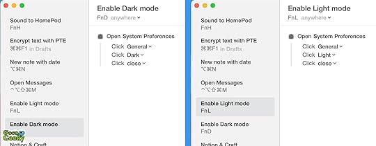 Two separate macros – one to turn on light mode and the other to turn on dark mode. Much faster than manually opening System preferences and going to the right tab to get it done. You could set other system setting at the same time to have things just right for your productivity environment on your Mac.