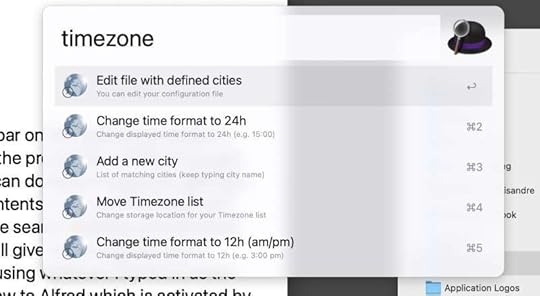 A useful workflow I downloaded gives me time zones. The coding within the workflow allows me to manage the cities in the list. I can easily add cities and remove cities. Change between 24-hour clock or 12 hour clock. I have a hotkey which immediately brings up the list of cities and their time zone information. Or if I type in the word time zone I get the options to manage the workflow. Alfred also does file search, web search, snippets, dictionary definitions, connects to music mini player. Alfred is also a great way to get to system commands like when you want your computer to go to sleep.