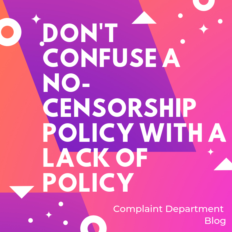 Easy there, sailor. Let's not confuse a No Censorship Policy with a complete lack of policy.