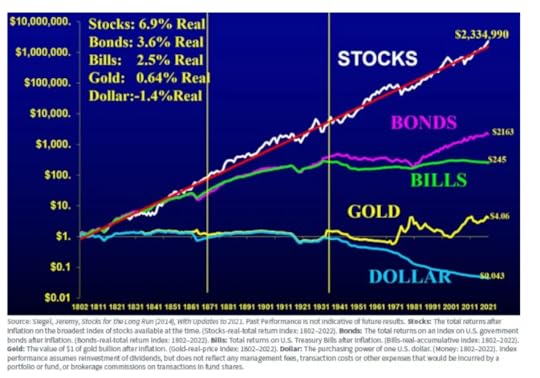 Mira esta gráfica de uno de los mejores libros sobre finanzas para ver cómo históricamente la renta variable supera a los otros tipos de activos en el tiempo: