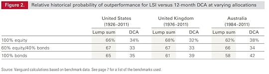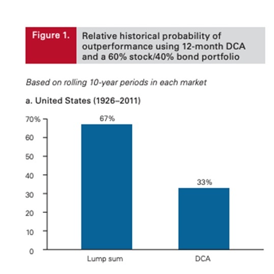 El título del estudio de Vanguard, la gestora fundada por John Bogle, es de lo más elocuente “Dollar-cost averaging just means taking risk later” o DCA simplemente significa asumir el riesgo más tarde.