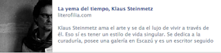 Hoy a las 7 pm en Central (contiguo al Centro de Cine, detrás del INS), se presenta La yema del tiempo de Klaus Steinmetz, con la participación de Esteban Ch y Gustavo Adolfo Chaves. Aquí enlace a entrevista en Literofilia.