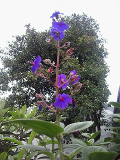 En junio del 2012 sembramos en el patio una estaca (5 cm) de esta planta. Creció a una altura de más de dos metros pero no floreó sino hasta hace un par de días, doce meses después. Atrás, el árbol de cas.