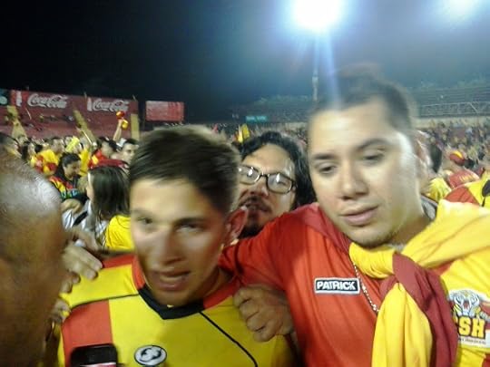 Invasión de cancha y este servidor robando cámara con el volante Elías Aguilar.En cuanto me rehabilite, escribiré con la calma que se merece este campeonato 23. Por lo pronto diré que el Club Sport Herediano le ganó a tdos los periodistas y locutores deportivos, a todos los seguidores de los equipos que no llegaron a la final y a toda esa provincia de beatos y panderetas. Remontamos y le ganamos a un país entero que cada día se parece más a Cartago.