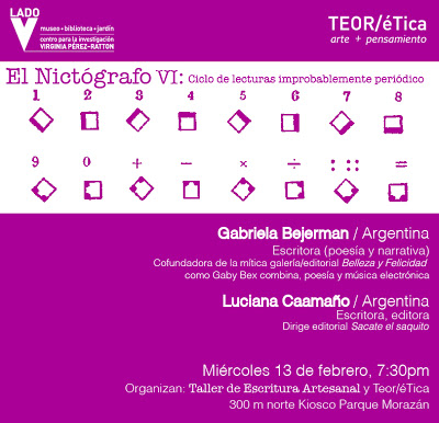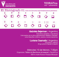 El Nictógrafo es un ciclo de lecturas que inició en febrero del 2010 producido por TEOR/éTica y el Taller de Escritura Artesanal. La idea original es la de invitar a escritores extranjeros que estén de paso por el país a una lectura y conversatorio informal, sin manteles y, preferiblemente, con birra en mano. Después del impasse del 2012, aprovechamos la visita de estas dos escritoras argentinas para reactivar el ciclo.Todos los Nictógrafos aquí