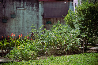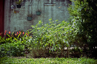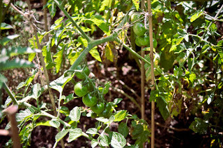 Menta, romero, estragón, albahaca, yerbabuena, perejil italiano, tomillo, jengibre y una tomatera cherry que se está volviendo salvaje.