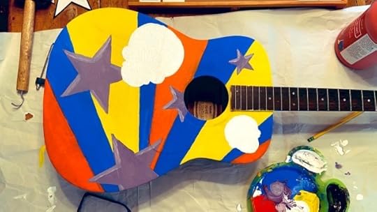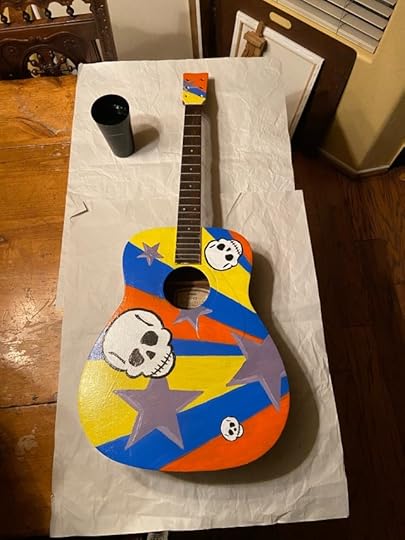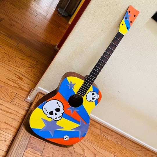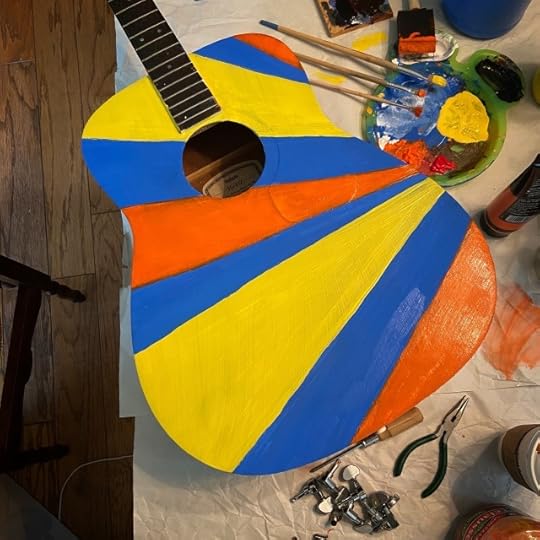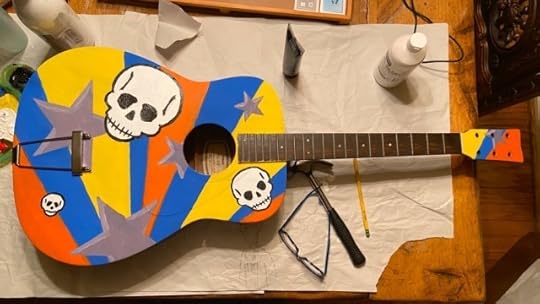 About a decade ago, I salvaged a broken acoustic guitar from our frat house neighbor’s trash. The bridge was ripped off. So, I repaired the wood and thought maybe someday I’d paint it and hang it on the wall or something.