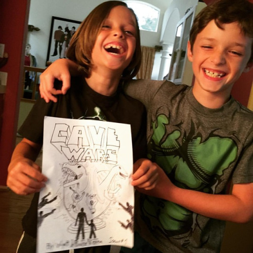 Though we have one week of school left, we started our summer project today—a comic book called “Cave Wars.” Wyatt came up with the idea, Boone helped hone the story, they both are doing rough sketches, and I’m using my limited artistic ability to do the final drawings based on those sketches. Cover down, 40-ish pages to go?