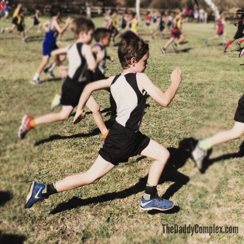 This is Boone at the start. Part of the way through the race, he took a tumble and banged up both of his knees. He then got up and finished the race with bloody knees. He didn’t finish near the front of the pack, but he did finish.