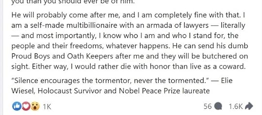 “He can send his dumb Proud Boys and Oath Keepers after me and they will be butchered on sight. Either way, I would rather die with honor than live as a coward.”