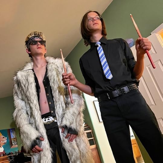 Behold! Our sons’ 2023 Halloween costumes: Boone as Mojo Dojo Casa House Ken (from the Barbie movie) and Wyatt as Green Day’s Tré Cool (Funko Pop version).