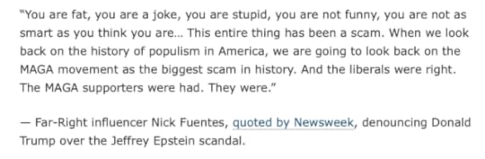 But, that Newsweek quote above? Glad he said it, glad he’s feeling betrayed, glad he’s realized he and every other MAGA cultist were conned.