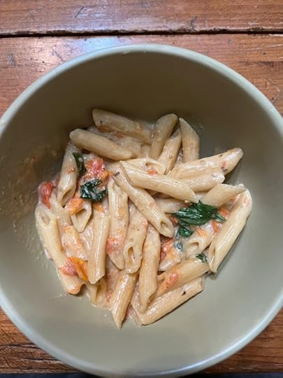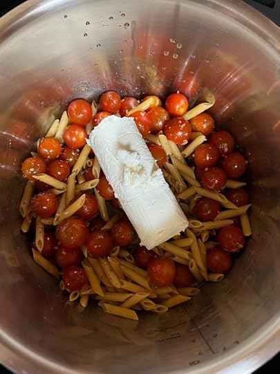 Aw, yeah. Penne, cherry tomatoes, garlic, veggie broth, olive oil, oregano, salt. And put a whole log of goddamn goat cheese up in that shit.