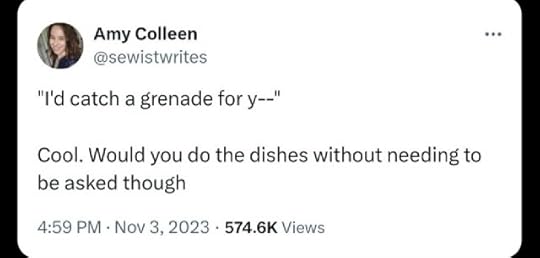 The great thing about huge declarations is that the most times you’re ever going to have to deliver on them is ONCE. And even that is vanishingly unlikely. The dishes happen every day. My feet hurt now. The kids need a lift to piano lessons every week. The grenade is hypothetical.