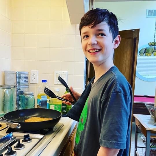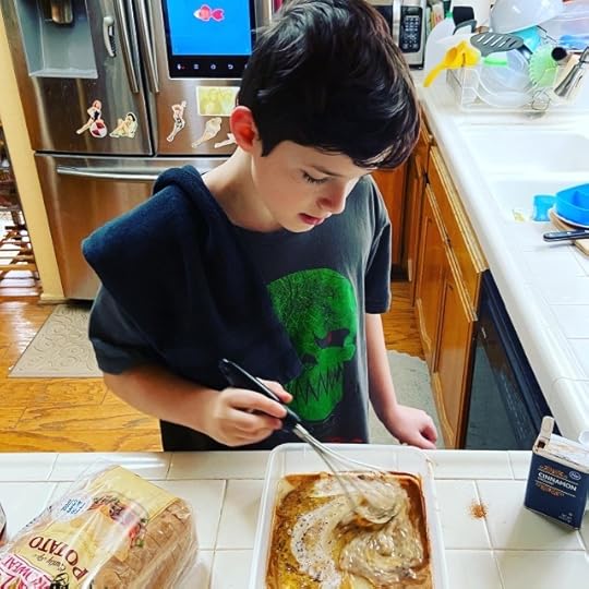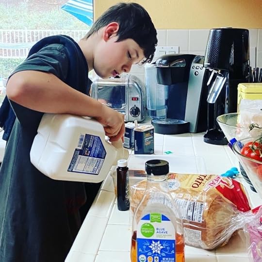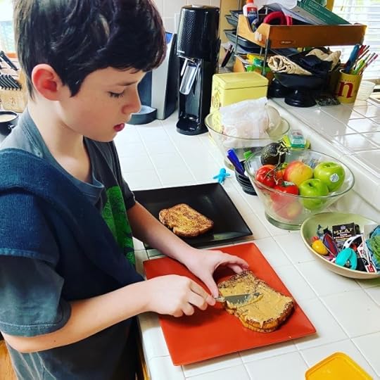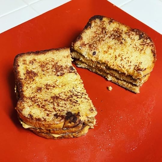 Boone woke before us and — ALL BY HIMSELF — made triple-decker peanut butter french toast for himself and Wyatt.
