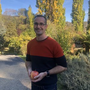 Thanks to Jo our whirlwind 3 day tour included meeting James Ashworth for a fabulously enlightening discussion about the fishing industry and local species, seasonality, seaweed harvesting and the Roaring Forties superb octopus. We ate splendid pies at The Woodfired Bakehouse in Cygnet and discussed bread and fire with Liam who was delighted to show us their fabulous woodfired oven. Then at my special request, we had a meet up, in her delightful home, with food stylist and chef Michelle Crawford, below right, seen in her garden. I have been an instagram follower and admirer of Michelle’s for some years and it was a total delight to sit with tea at her table and wander her wild and wonderful garden. A rose never smelt so sweet. I hope to return there one day soon. Dinner and funky wines at Der Makr’s wine bar Lucinda was a treat one evening, as was breakfast at the Pigeon Hole Bakery. Lunch at The Agrarian Kitchen was a highlight and then a tour of Rodney’s beautiful home, school and gardens, he is seen below with a giant apple from his overladen tree. Fermenter @roughrice, Adam James, was teaching at the Agrarian kitchen school that day, it was so good to meet him; another mad fermenter, he may kindly make some of what we need for our dish.