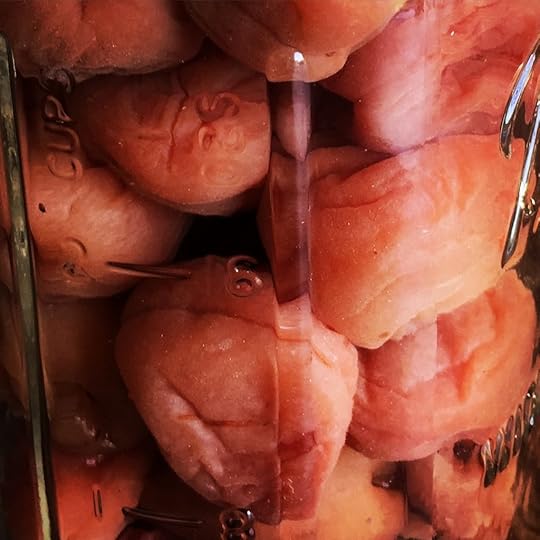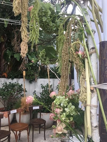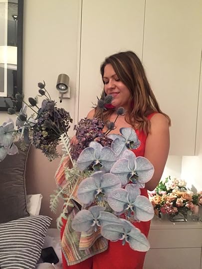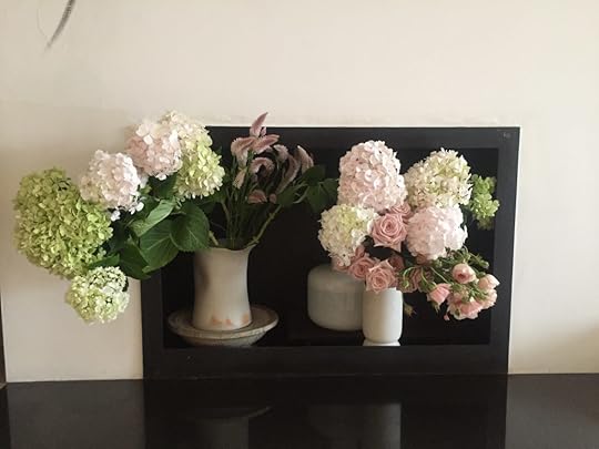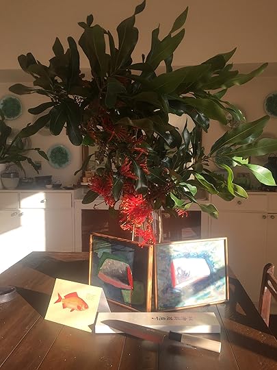 Fish and flowers were the order of the day I turned sixty! Left and right eye of salmon paintings by Nils Benson who sent these over from his home in LA, cleverly they arrived on the day. These gorgeous flowers were from me, a celebration of my love of the firewheel tree and the Japanese knife, my gift from India.