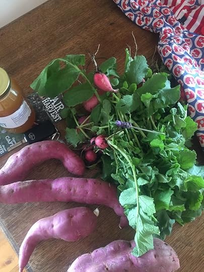 Fair Harvest honeybees produced this delectable honey and the just dug, by hand from loose humus rich soil purple sweet potatoes were moorishly sweet and sticky when dry baked.Those were the last of the radishes and they starred in a couple of the Japanese dishes I made in my Koji and Oden classes later that week.