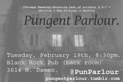 We launched our Pungent Parlour reading series on the 19th of February, and had a solid turnout, people are excited to come back to it, Gapers Block did a fine mention of our fireside ambiance, and we are booked for 3rd Tuesdays of the month going forward at Black Rock Pub and Kitchen. We're jacked to have a regular thing, so we can get off on oral lit. We had a wide variety of pieces; some humorous personal essays, some violent-esque, intense short stories, a fantasy story. I'm excited to see the range each future month to come.
