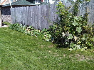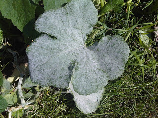 It also seems my pumpkins may be suffering from what's called "powdery mildew" as it looks like the leaves have been dusted with baking soda. I can expect the leaves to start dying soon. Next door, on the other side of the fence, our neighbors have a little circular pool. Not a kiddie, wading pool, but not a big, big pool. But it's a pool, and I assume some chlorine. I wonder if some pool splashes seeped through the wooden fence gaps and coated the leaves, making them susceptible to some fungus spreading. But, before I go blaming neighbors for my pumpkin's disease, I learned in the forums that I should not have been watering the leaves themselves. And all through the summer I'd give them good splashes from the hose, thinking I was cooling them down, since they were sitting out in the hot sun burning like fair skinned Irish kids. But their outdoor activities caught them a variable case of athlete's foot that no fungus cream can treat.