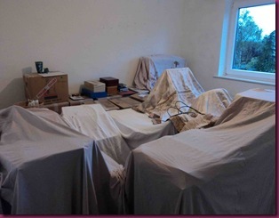 The move has eaten up two months writing time and while I do have a spacious new study, I haven’t been able to use it very much. The new house needs quite a bit of work doing to it and men have been on the roof, up at the windows and under the floorboards. For the last two weeks my study has looked like this: