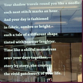 The project is now complete and even includes some poems! As well as my words, there are colourful silhouettes, all of it cut from vinyl and installed by Sam Jones. Here is some of it; if you visit , look carefully if you want to spot everything.