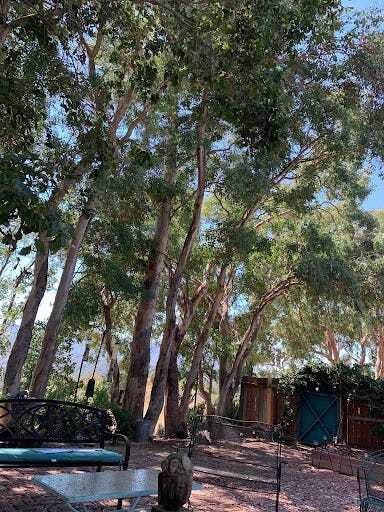 Sunday afternoon. Sitting on the patio with a fresh cup of coffee in the Elephant mug I love, looking at the Eucalyptus trees that invited me to buy this house in 1981. These trees are threatened in Topanga, CA because they ignite, spark and burn hot and so many locals wish them cut down. Since I moved here, the original trees have self-seeded and what was a single line is on its way to being a grove.