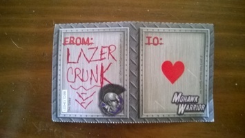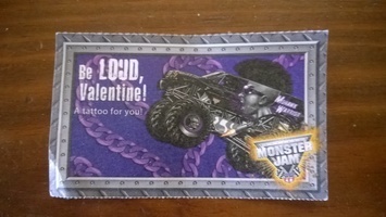 Yesterday, being the day before Valentine’s Day, someone was handing out valentines. She wore a hood, like, a hood unconnected to her shirt, with monster trucks on it and large chains weighing it down. She was so dedicated to the theme, even the valentines were monster truck related. Thanks for the valentine, Lazer Crunk!