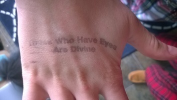 Some other fun tidbits from last night: the lights on the walls all had googly eyes, and the hand stamp they used reads Those who have eyes are divine.