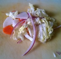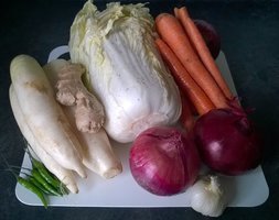 Prepare the nappa cabbage, daikon, carrots, and onions.