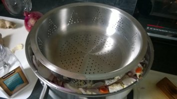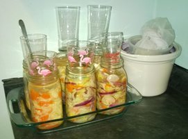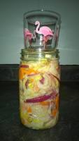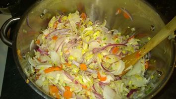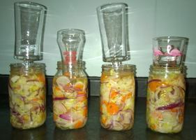 Put them in a large pot or bowl and mix them up. Combine the salt and water, making sure the salt is largely dissolved. Pour the salt water over the vegetables, and weigh down the vegetables so that they are covered with the water. The vegetables will crunch down a little bit, so initially they might not be covered. If you think you need more salt water to properly cover the vegetables, add more.