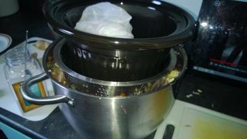 If you’re in the US, you can mostly likely get mason jars from your local hardware store (I hit up the True Value near me). If you have a crockpot, you can use the crock from that. If you don’t (or can’t spare your crock for a week or two), you can often buy standalone crocks from thrift stores for really cheap.