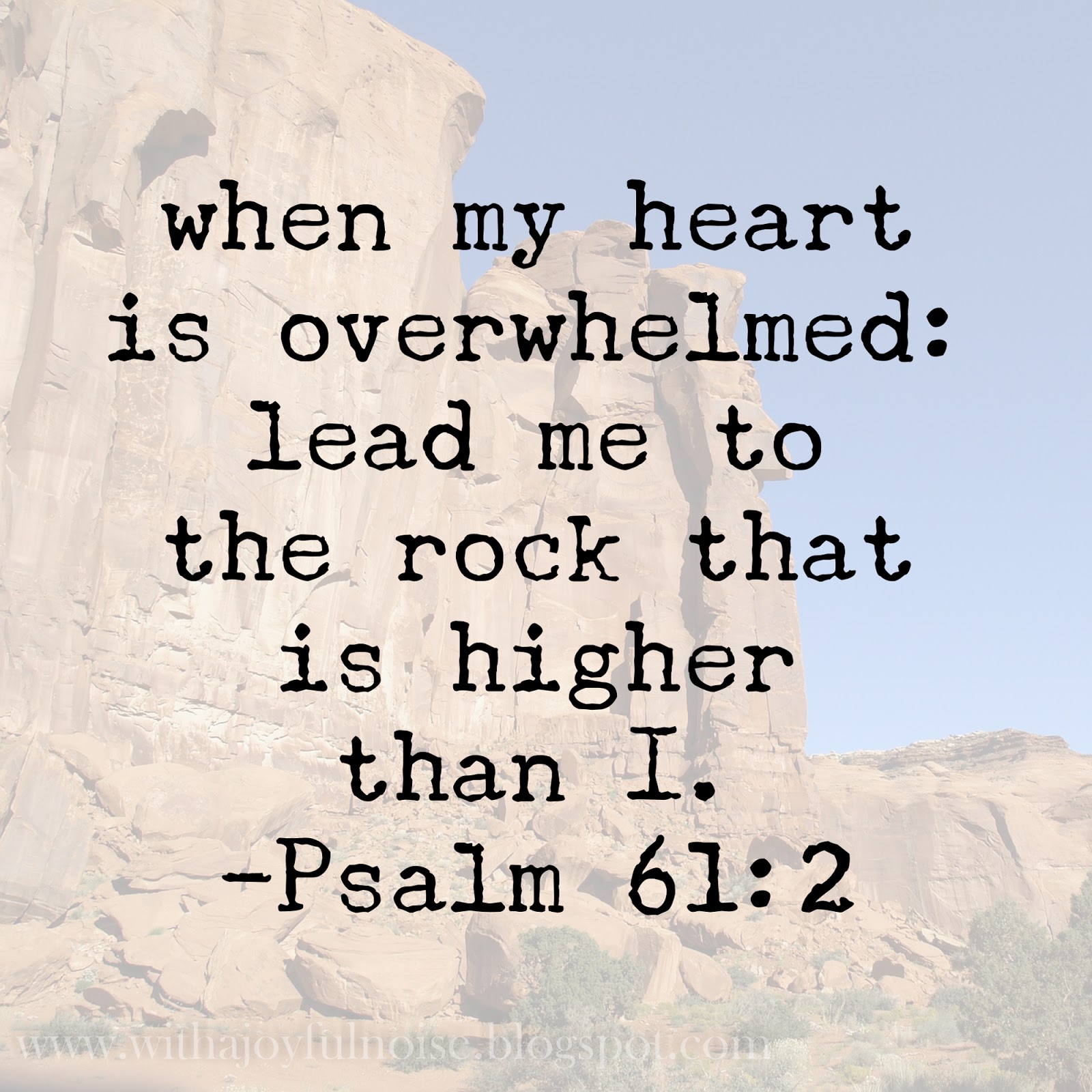 "Hear my cry, O God; attend unto my prayer. From the end of the earth will I cry unto thee, when my heart is overwhelmed: lead me to the rock that is higher than I. For thou hast been a shelter for me, and a strong tower from the enemy. I will abide in thy tabernacle for ever: I will trust in the covert of thy wings. Selah. For thou, O God, hast heard my vows: thou hast given me the heritage of those that fear thy name." (Psalms 61:1-5)