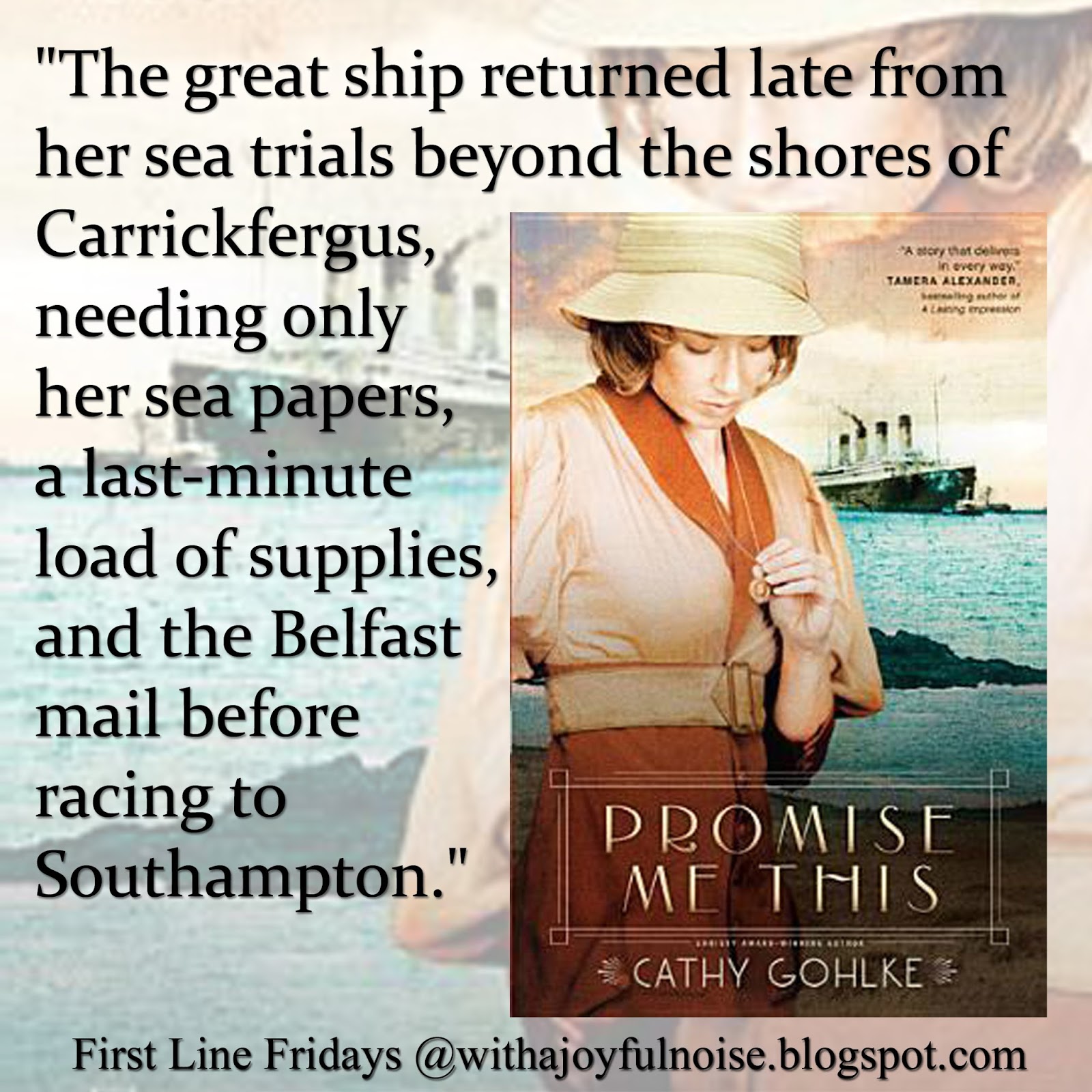 I stood at my bookshelves for a while, deciding which book to pull for this First Line Friday. I landed on Cathy Gohlke's Promise Me This which is a Titanic and WWI story. This one I got through Tyndale Rewards program (basically, you earn points then spend them on books--if you sign up with my link, they'll give you a bonus 25 points!). You may read my full review of the book here. For now, I'll just share the first line.