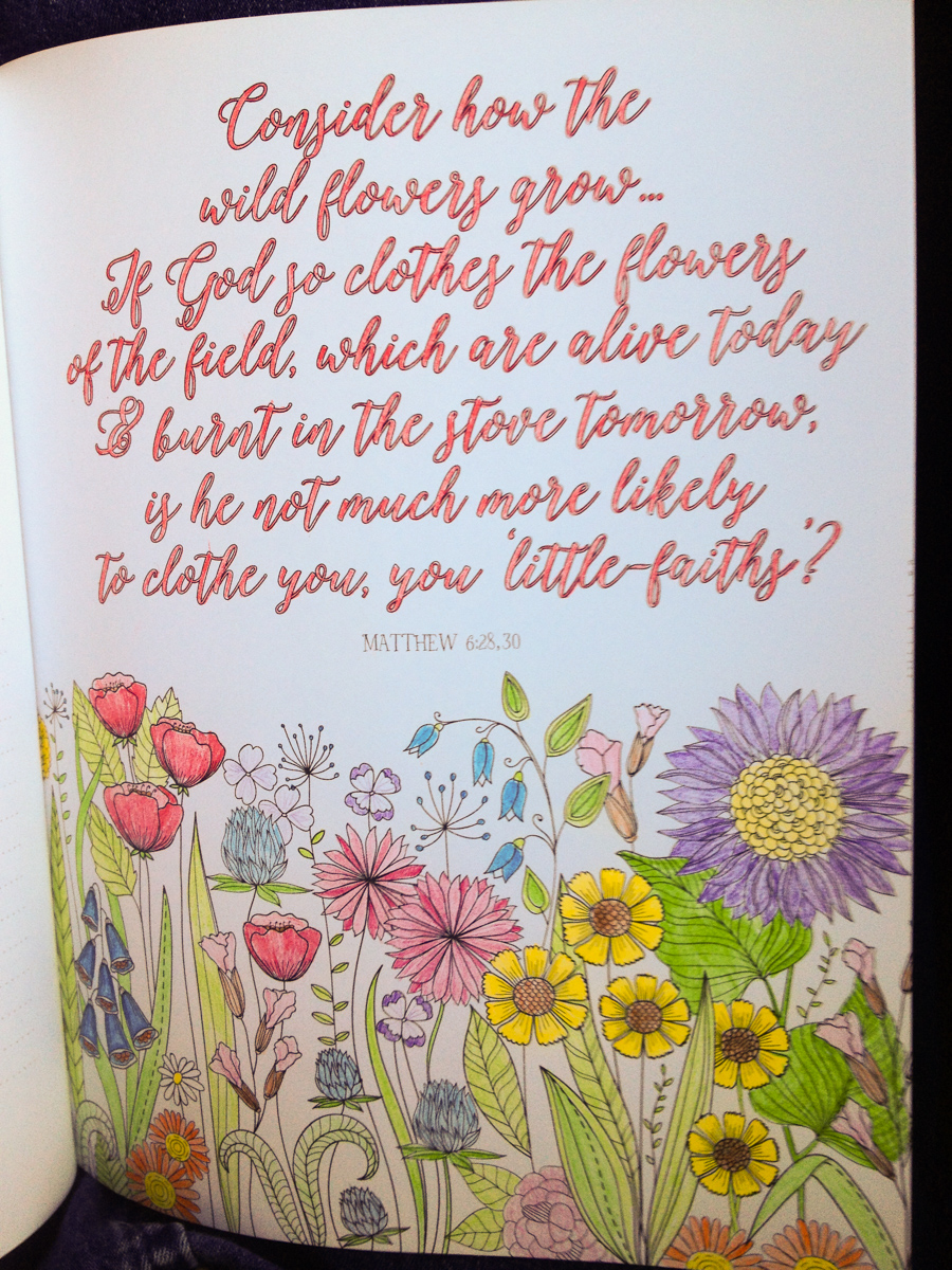 My colored pageI finally got in to review a coloring book! The whimsical drawings are fun and cute, the lines fairly clear and easy to follow. The format of it is interesting too--one side a picture, the other side a prayer journal section.As I colored a picture, I noticed that some of the lines overlaid others. For example, you would see a stem then on top of it you would see a flower--with both lines crossing.