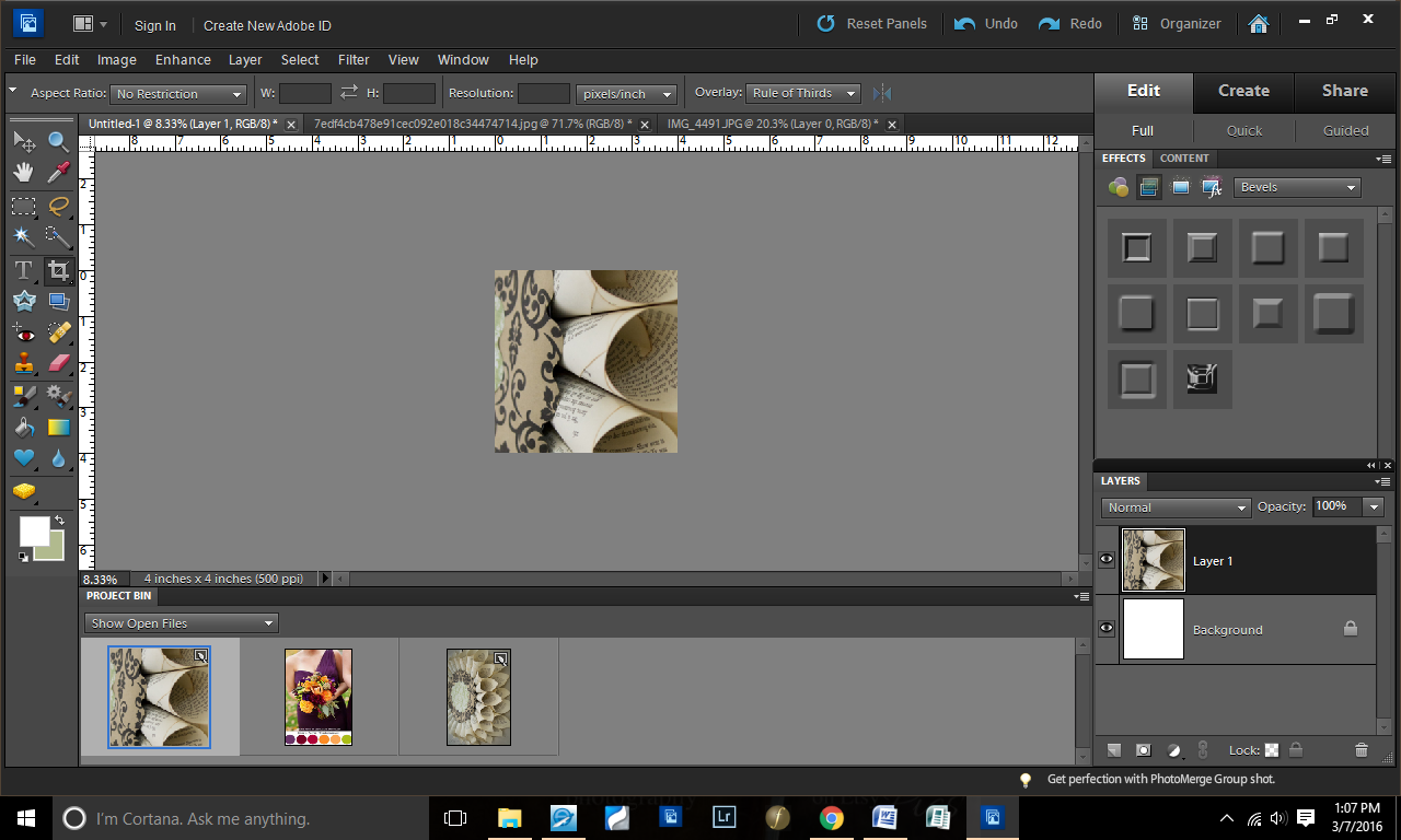 First, I create a 4x4" blank file (resolution at 500 pixels). Then, I dragged an image I had onto it.