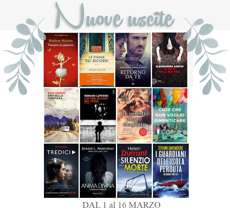 Le nuove uscite sono sempre dietro l'angolo, e diciamocelo, è pure difficile stare a dietro a tutte queste letture. Sono tante e vorrei quasi immergermi tra le parole di ogni libro che ho citato qui sotto, ma come al solito selezionerò ciò che vorrò leggere. In particolar modo oggi vi illustro quelle che, secondo il mio modesto parere, sembrano essere le uscite più appetibili di questo mese di marzo. E voi cosa ne dite? Avete un libro che state attendendo con trepidazione per poter correre in libreria, questo mese? Per le uscite di fine marzo vi rimando al 17. Mi raccomando, vi aspetto per discuterne!