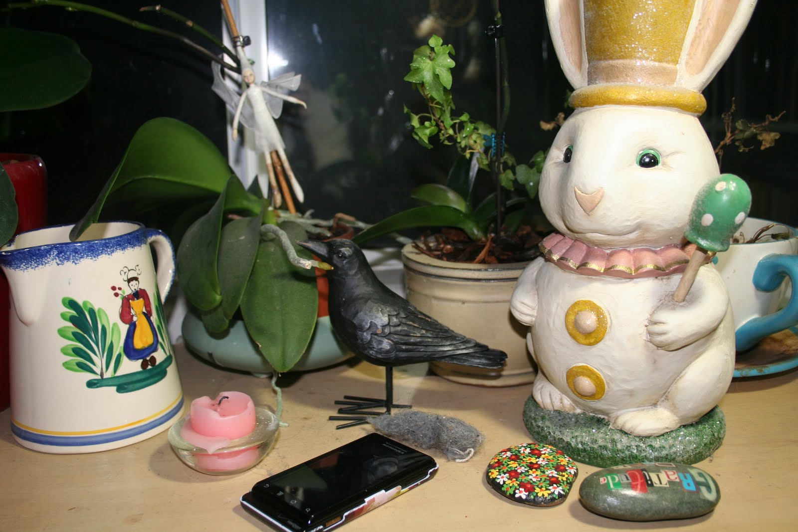 The magic bunny and the dust bunny try to save my Droid from the twitter demon.