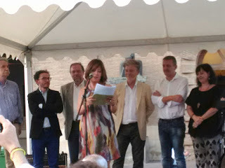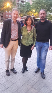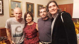 En la foto, de Ana Labaila, con David Guirao, Pablo Cruz y Pepe Trívez.Con el mismo vestido que en la entrega del premio. ¿Por qué? Porque formaba parte de la dedicatoria del Cervantes Chico a Zaragoza. A los presentes, y a los ausentes: sobre todo a los que fueron llamados por los dioses en los últimos meses, y que estuvieron aunque no estaban...