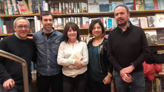 En Librería "Anónima" de Huesca, el día 28 de abril, con Chema y Ana, libreros, Alfonso Castán, editor de Contraseña, y Alberto Gamón, ilustrador de la preciosa cubierta. Cuando acabé de escribir Postales coloreadas, cuando puse el último punto y final, temblé. Nunca me había pasado hasta ese momento al finalizar una novela. Tuve la sensación de vacío sumada a la de pérdida: fue como si hubiera perdido otra vez a mi abuela Mercedes, a mi tía Pilar, a todos los que se han ido ya.