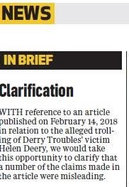 · The myth that I had been trolling Helen Deery when this was nothing more than a two way spat on social media at the end of which Helen decided to use her victim status to sell it as something more sinister in the press in a bid to silence my call for accountability from the Bloody Sunday March Committee she is part of.