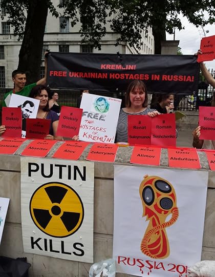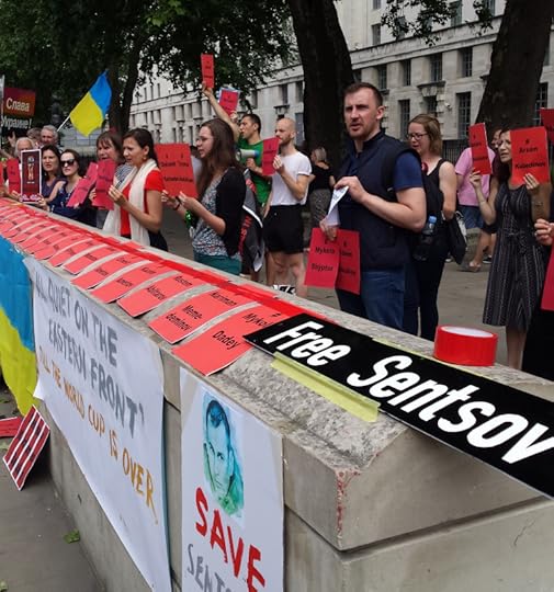 Sasha Dovzhyk, one of the organisers of the protest, said: “It’s a pleasant day in London, less so in Labytnangi colony, where Oleg Sentsov was brought to rot for 16 years after he had served four years on falsified charges in Russian prisons. It’s the 21st day of his hunger strike. He will not end it until all 70 Ukrainian political prisoners kept as hostages by the Kremlin are released.”