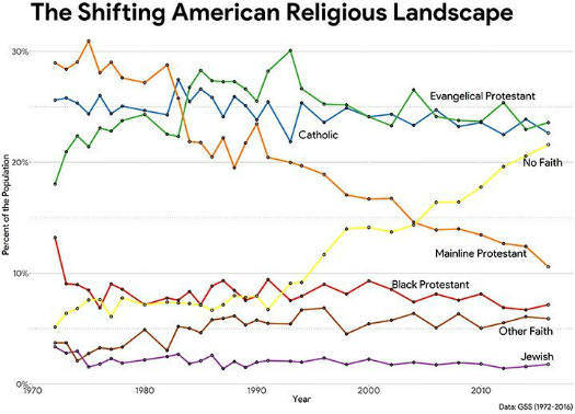 Maybe Mike Pence is reading other kind of studies, but data shows that the number of Americans with no mainstream religious affiliation has been rising. Pence is certainly not telling only lies, but he is telling only one side of the story because the percentage of the population who believes in a literal Bible and attends church weekly has stayed relatively steady for the last 25 years, while the number of people with no faith is going up.